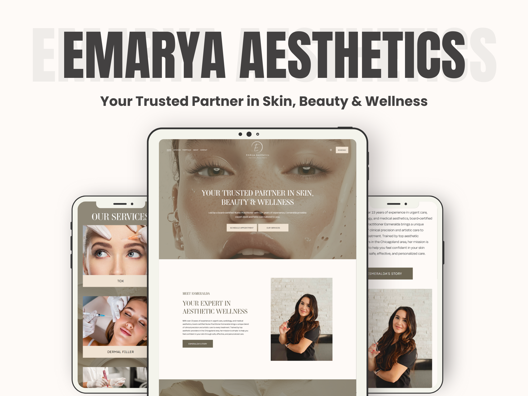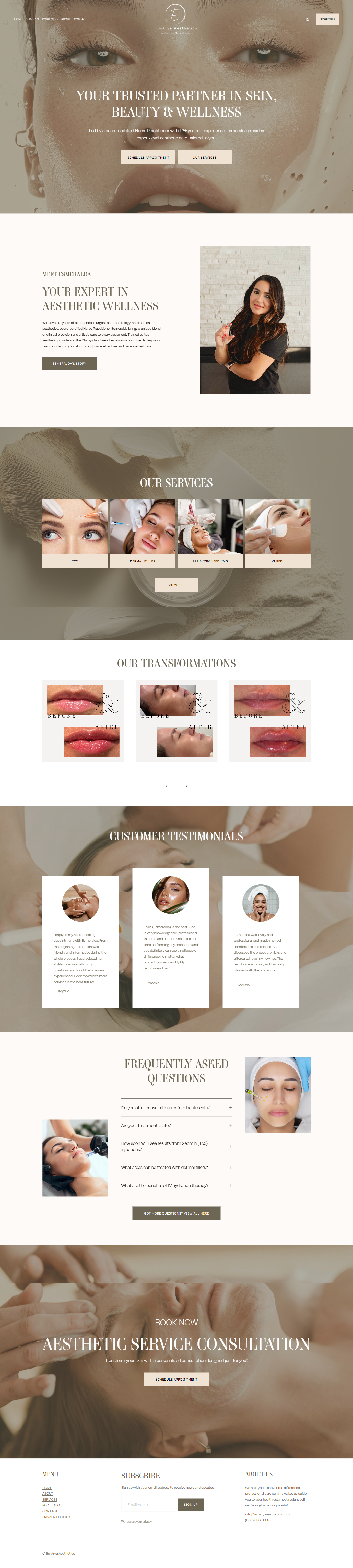 This website was created to embody the calm sophistication and clinical expertise behind EmArya Aesthetics a trusted skincare and wellness studio led by board-certified Nurse Practitioner Esmeralda. Designed with a soft, luxurious aesthetic, the homepage introduces her 13+ years of medical and aesthetic experience while conveying warmth, trust, and professionalism. Each section from services and transformations to patient testimonials is crafted to highlight expertise and results without losing the human touch. With intuitive navigation, refined typography, and an elevated visual palette, the design reflects Esmeralda’s mission: to help every client feel confident, rejuvenated, and radiant in their own skin.