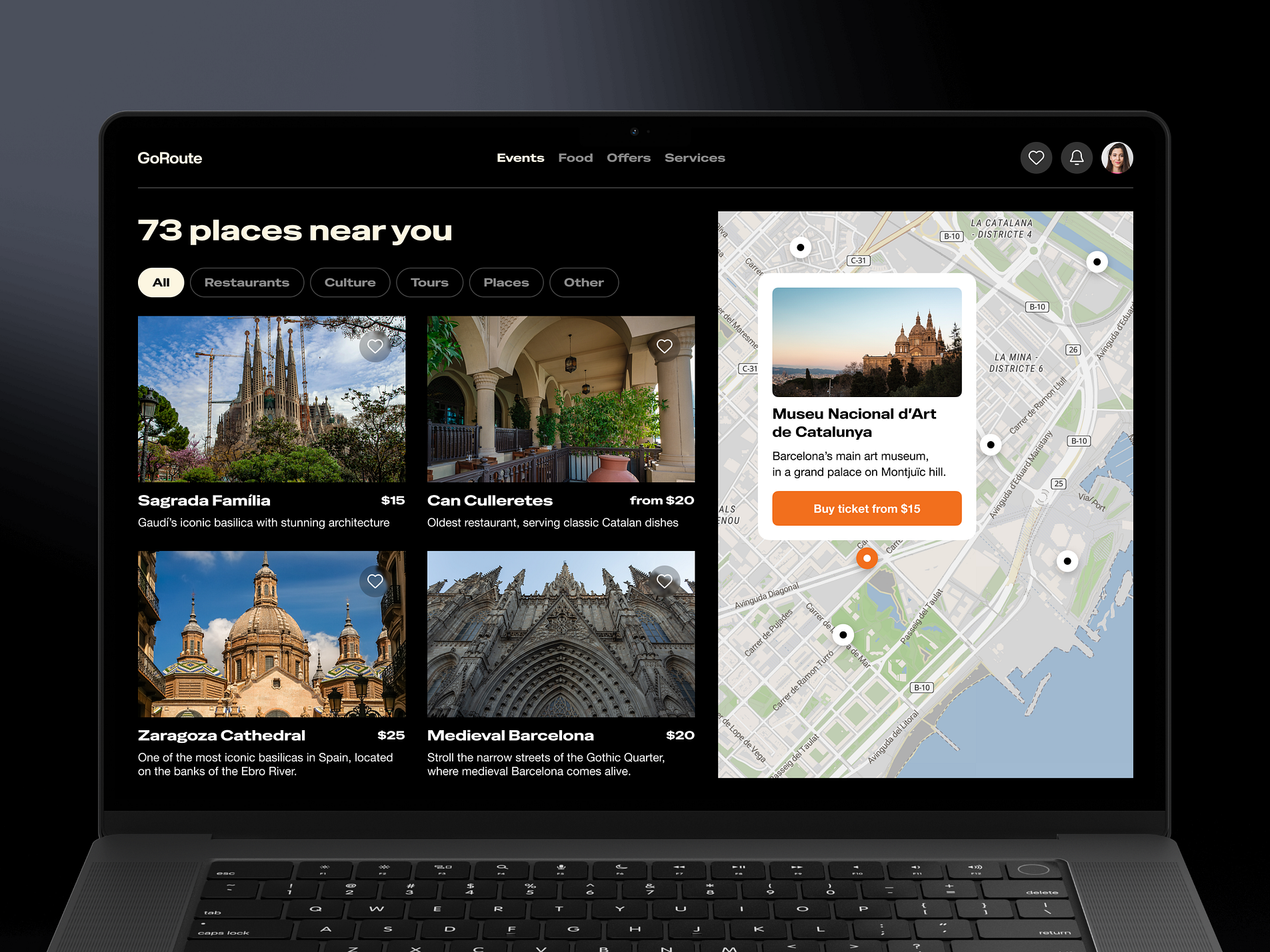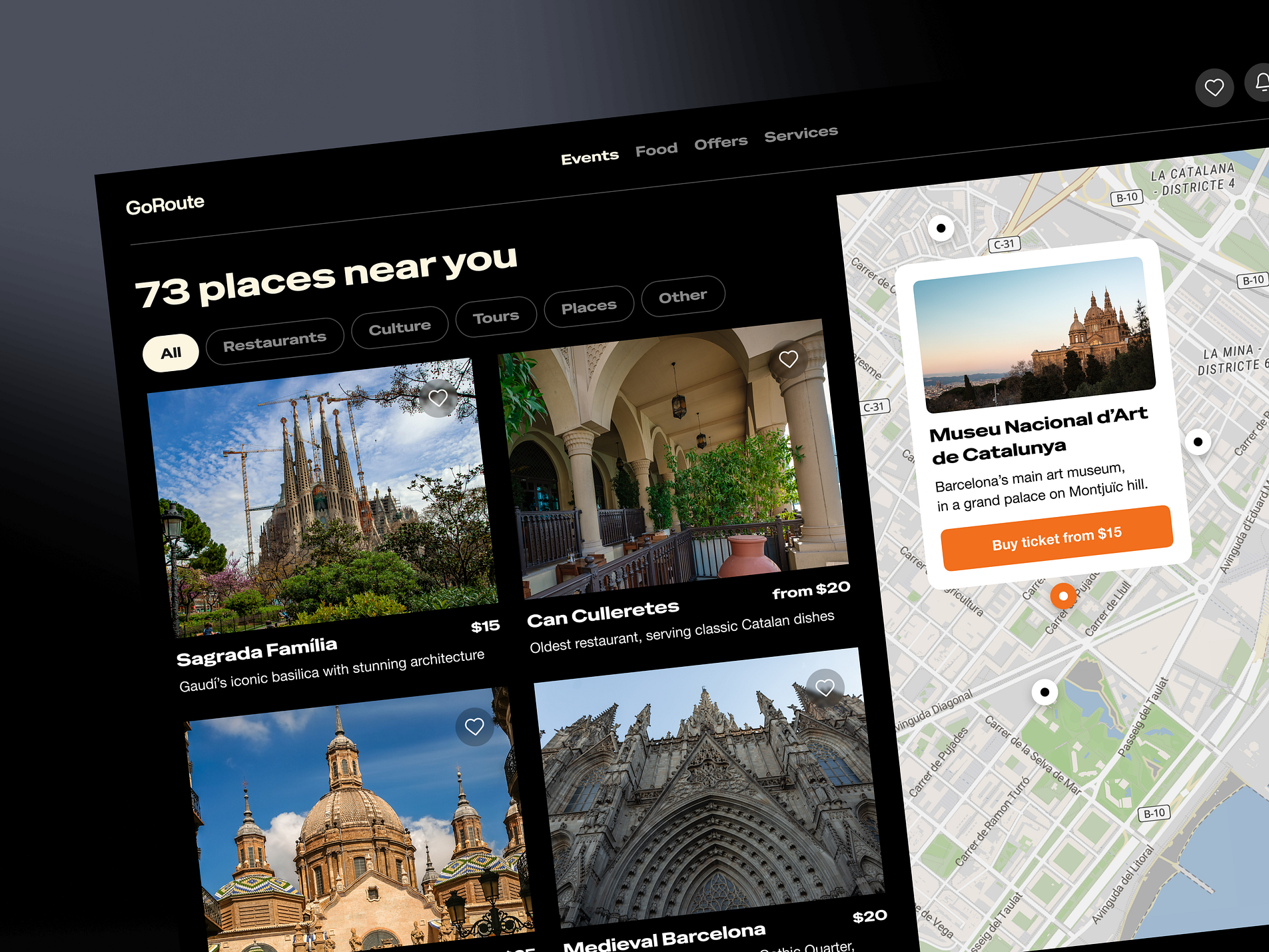 This web app was designed to simplify travel planning by combining activity discovery with real-time route visualization. The interface allows users to browse categorized events while viewing their locations on an interactive map, making comparison and decision-making effortless. A refined color palette with bold accent tones highlights key actions and keeps the experience visually engaging. Built with a focus on clarity and usability, the app delivers a streamlined and intuitive planning experience for modern travelers.