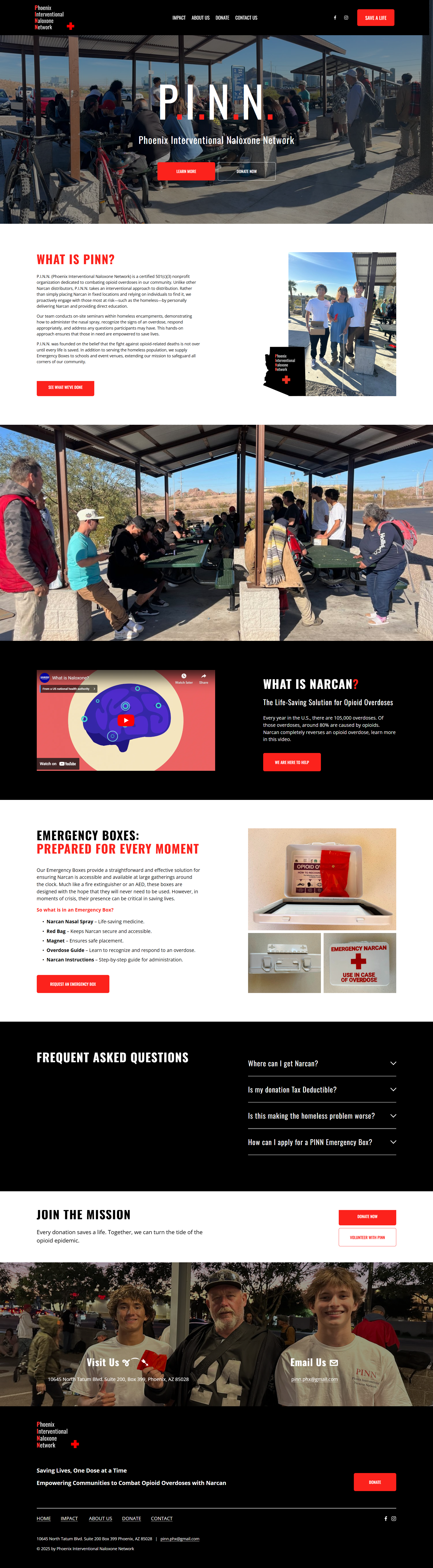 This website was designed to amplify the mission of P.I.N.N., a certified 501(c)(3) nonprofit organization combating opioid overdoses through proactive outreach and education. The design focuses on clarity, empathy, and community impact using bold typography, clean visuals, and accessible navigation to communicate the organization’s life-saving mission. Each section highlights their hands-on approach: delivering Narcan directly to those most at risk, hosting on-site training, and distributing Emergency Boxes across schools and event venues. The site conveys urgency and hope in equal measure, encouraging visitors to donate, volunteer, or get involved. Built with a balance of compassion and professionalism, it positions P.I.N.N. as a vital force in Arizona’s fight against opioid-related deaths.