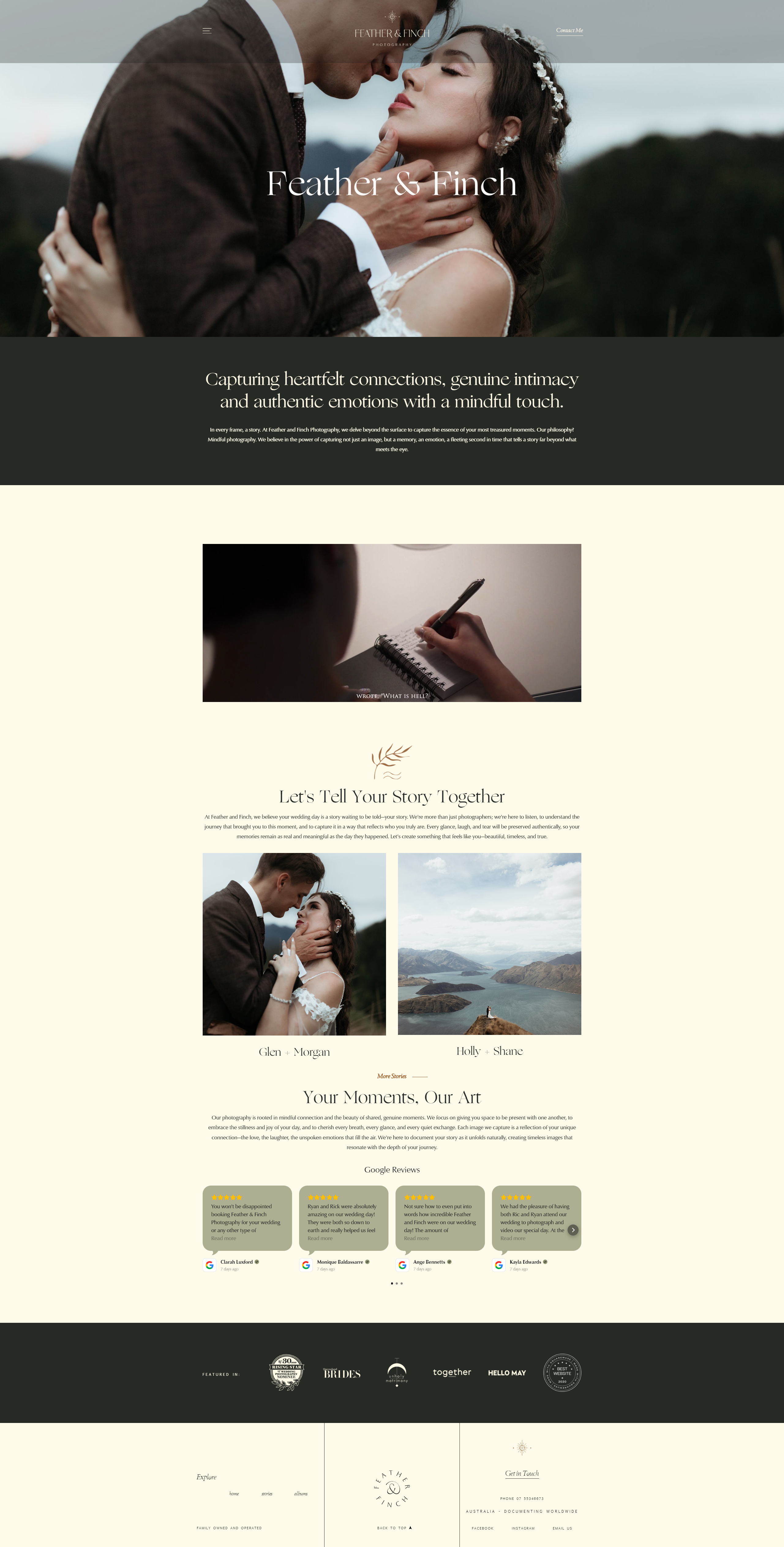This website was designed to capture the heart and authenticity of Feather & Finch’s documentary-style wedding storytelling. The homepage opens with an emotional narrative that reflects their philosophy raw, real, and unposed. The design centers around immersive visuals, elegant typography, and organic spacing to evoke warmth and intimacy. Every element from client stories to curated galleries is crafted to let emotion lead the experience. Built with a minimalist yet cinematic aesthetic, the site invites visitors to feel the beauty of genuine connection and timeless love. The result is a digital space that feels personal, poetic, and deeply human just like the moments Feather & Finch capture through their lens.