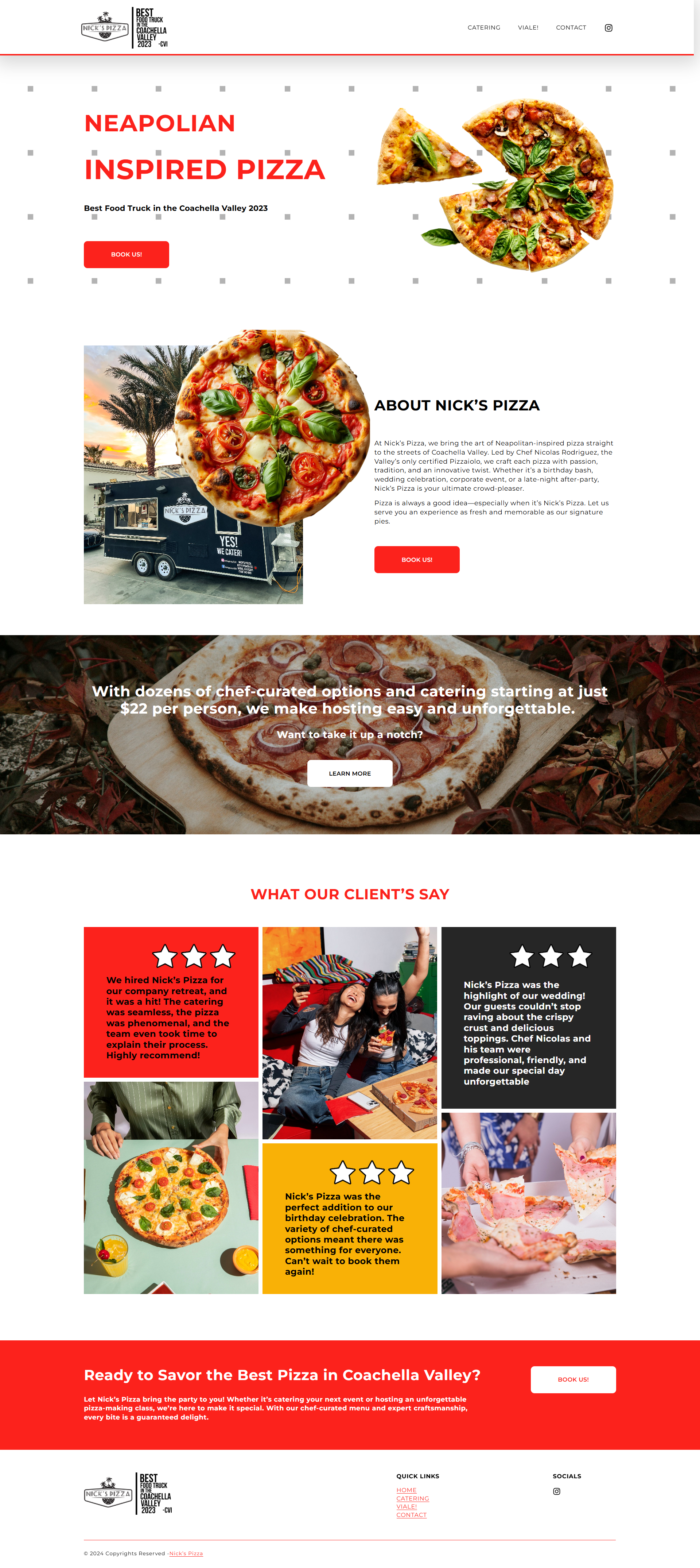 This website was designed to showcase the vibrant personality and culinary expertise behind Nick’s Pizza led by Certified Pizzaiolo and Classically Trained Chef Nick Rodriguez. The design blends rustic warmth with modern elegance, using rich imagery and bold typography to highlight the brand’s authenticity and craft. Clear calls to action, engaging copy, and an intuitive layout make it easy for visitors to explore catering options, events, and bookings. Built for both functionality and flavor, the site captures the essence of Nick’s mission: bringing the art of pizza-making and unforgettable dining experiences to every celebration.